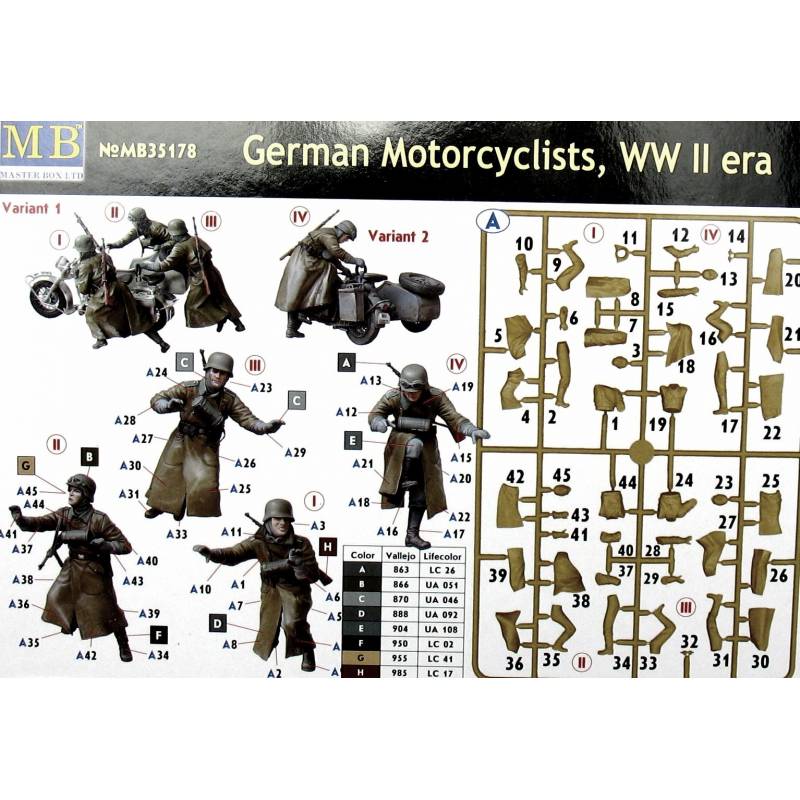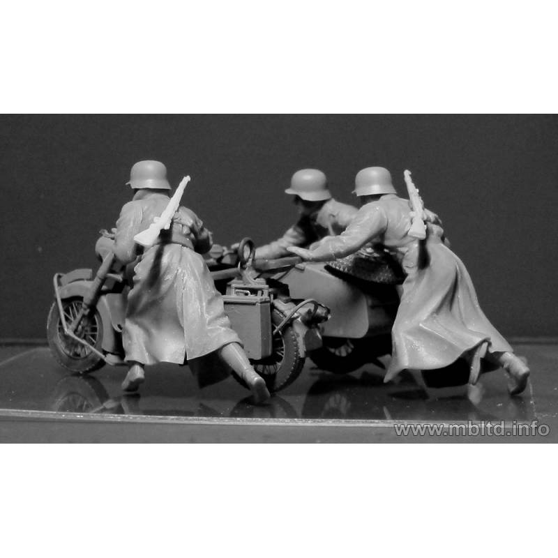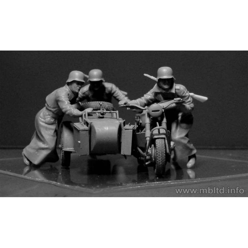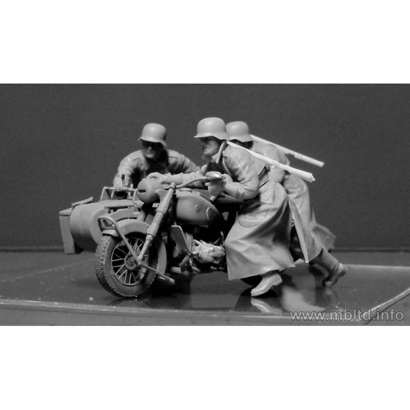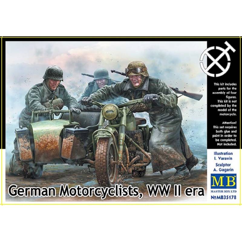 Le set Master Box 35178 représente précisément ce type de situation avec un groupe de soldats motocyclistes allemands de la Seconde Guerre mondiale. Les figurines sont représentées dans des poses naturelles évoquant un moment de discussion, de préparation ou d’attente entre membres d’une unité de reconnaissance ou de liaison.