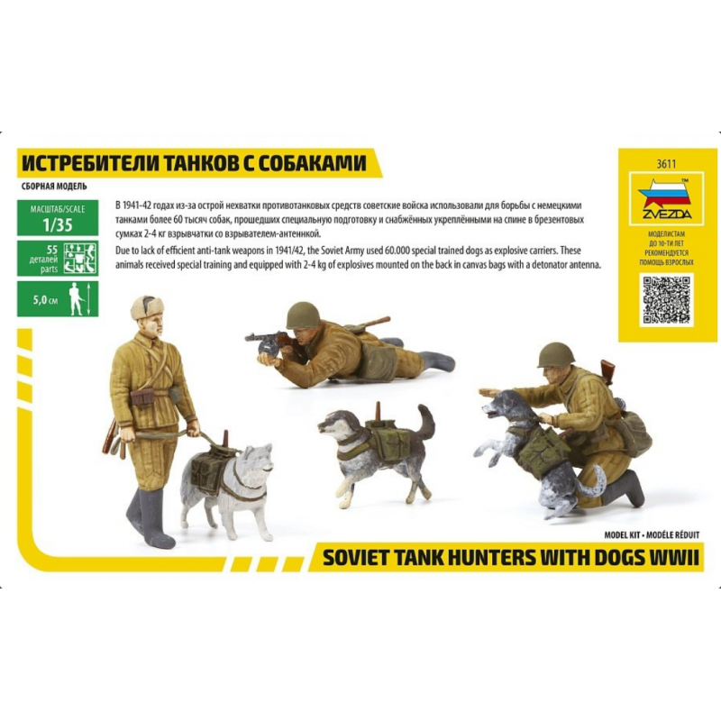 Ce set de figurines Zvezda met en scène un épisode méconnu et controversé de la Seconde Guerre mondiale : l’utilisation par l’Armée rouge de chiens dressés pour la lutte antichar. Dans les premières années du conflit, notamment entre 1941 et 1942, face à la puissance des blindés allemands et au manque d’armes efficaces, les Soviétiques développèrent des unités spéciales utilisant des chiens porteurs d’explosifs pour neutraliser les chars ennemis.