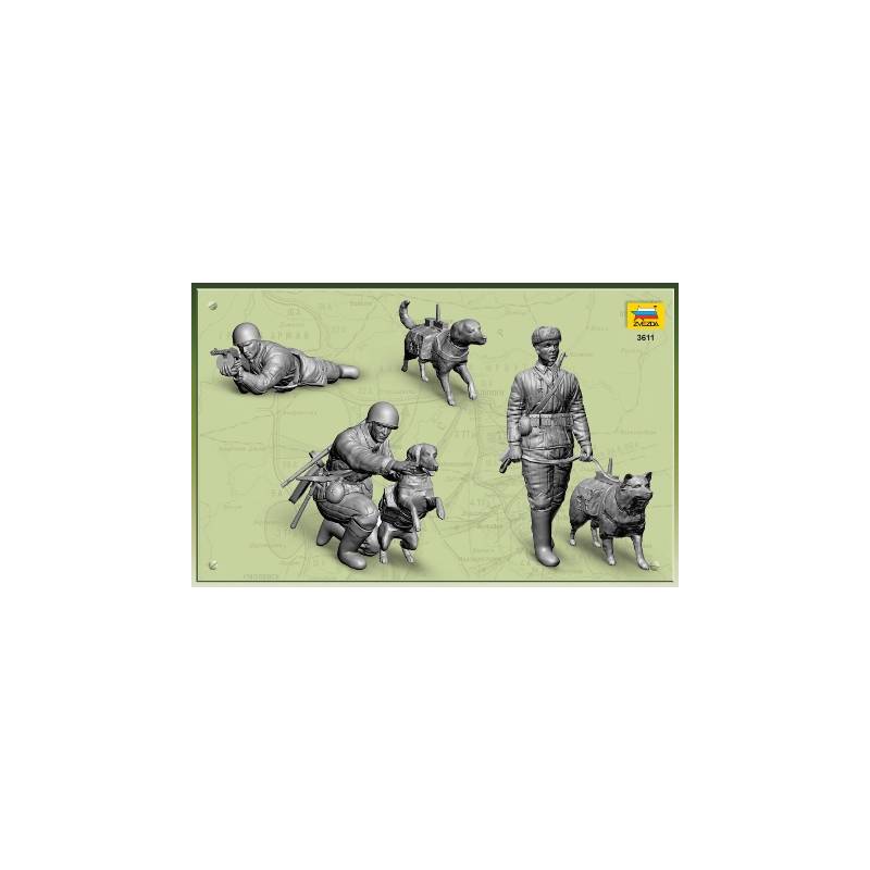 Le set Zvezda 3611 permet de représenter cette unité particulière à travers trois figurines de soldats soviétiques accompagnés de deux chiens. Les poses sont réalistes et évocatrices, illustrant des scènes de préparation ou d’engagement sur le front de l’Est. Les uniformes sont fidèlement reproduits, avec les équipements caractéristiques des troupes soviétiques du début de guerre.