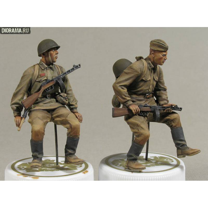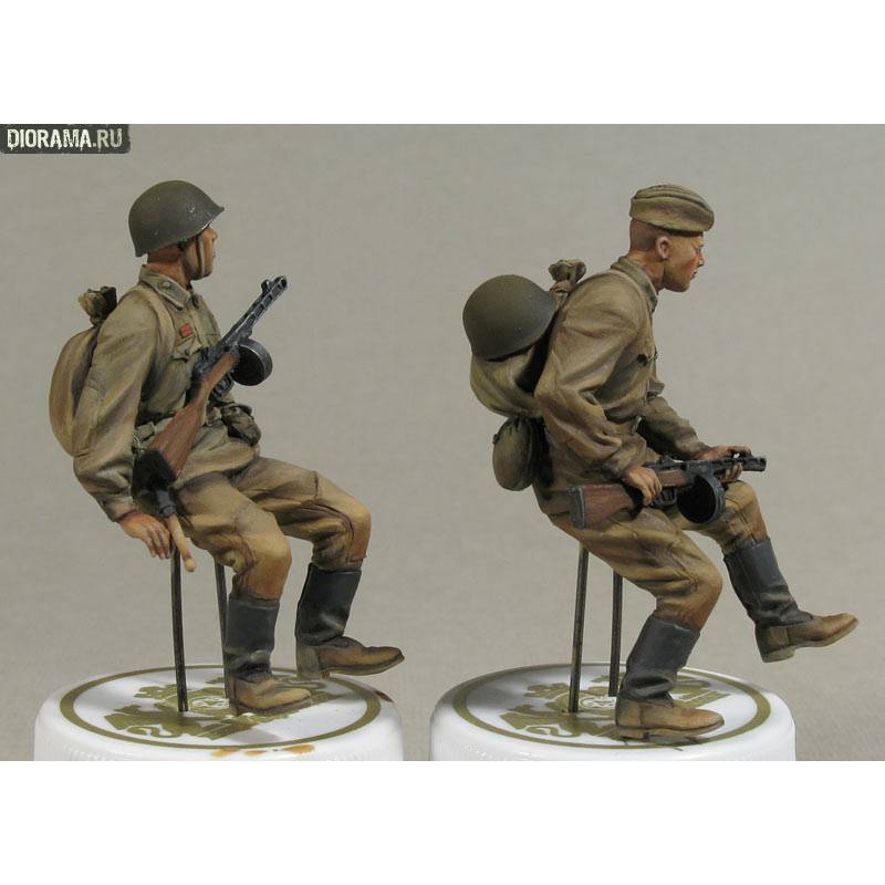 Ce set de figurines en plastique injecté à l’échelle 1:35 représente des soldats soviétiques transportés à l’extérieur d’un véhicule, une pratique très répandue au sein de l’Armée rouge durant la Seconde Guerre mondiale. Souvent juchés sur des chars, des canons automoteurs ou des camions, les fantassins utilisaient ce mode de déplacement pour suivre l’avance rapide des unités blindées, notamment lors des grandes offensives sur le front de l’Est.