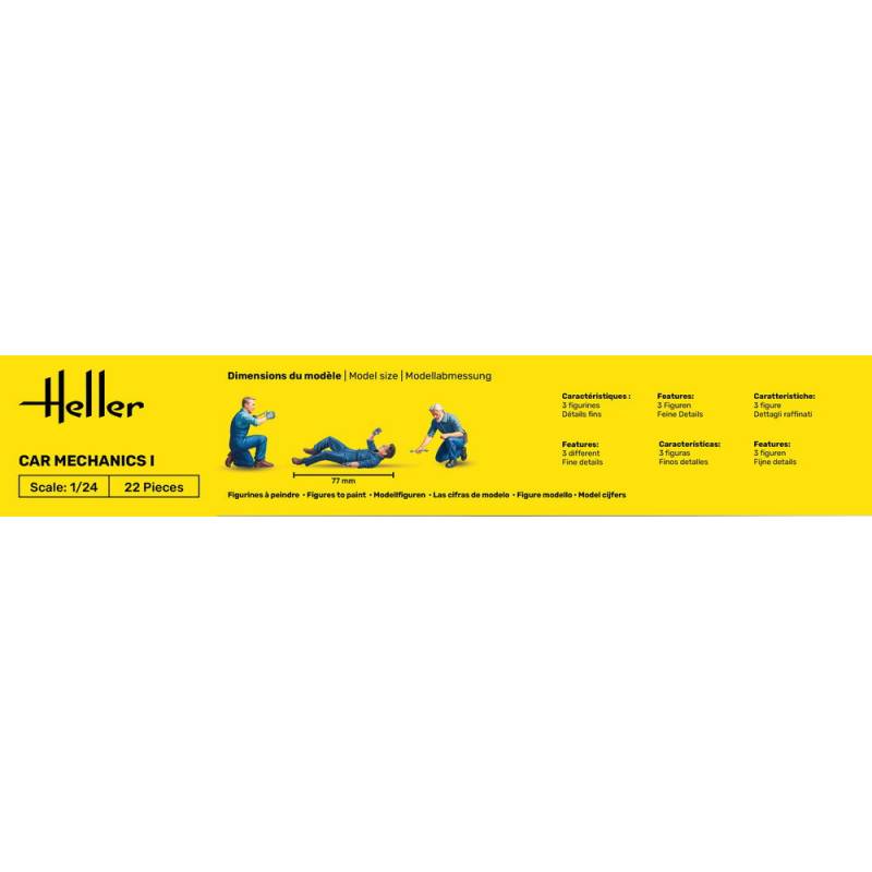 Ce set Heller 82755 comprend trois mécaniciens automobiles représentés dans des poses très spécifiques, idéales pour créer une scène de réparation réaliste dans un garage ou sous un véhicule au 1/24.