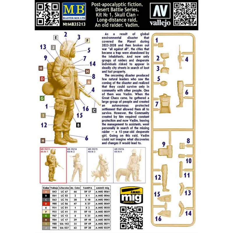 Ce set de figurine au 1/35 de Master Box appartient à la série Desert Battle Series et met en scène un personnage issu d’un univers post-apocalyptique ou de conflit moderne dans un environnement désertique. Intitulé « An Old Raider – Vadim Skull Clan Long Distance Raid », ce kit représente un combattant expérimenté appartenant au clan fictif Skull, engagé dans un raid de longue distance à travers un territoire aride et hostile.