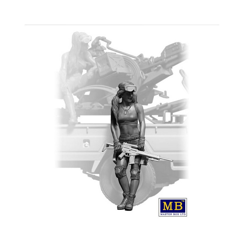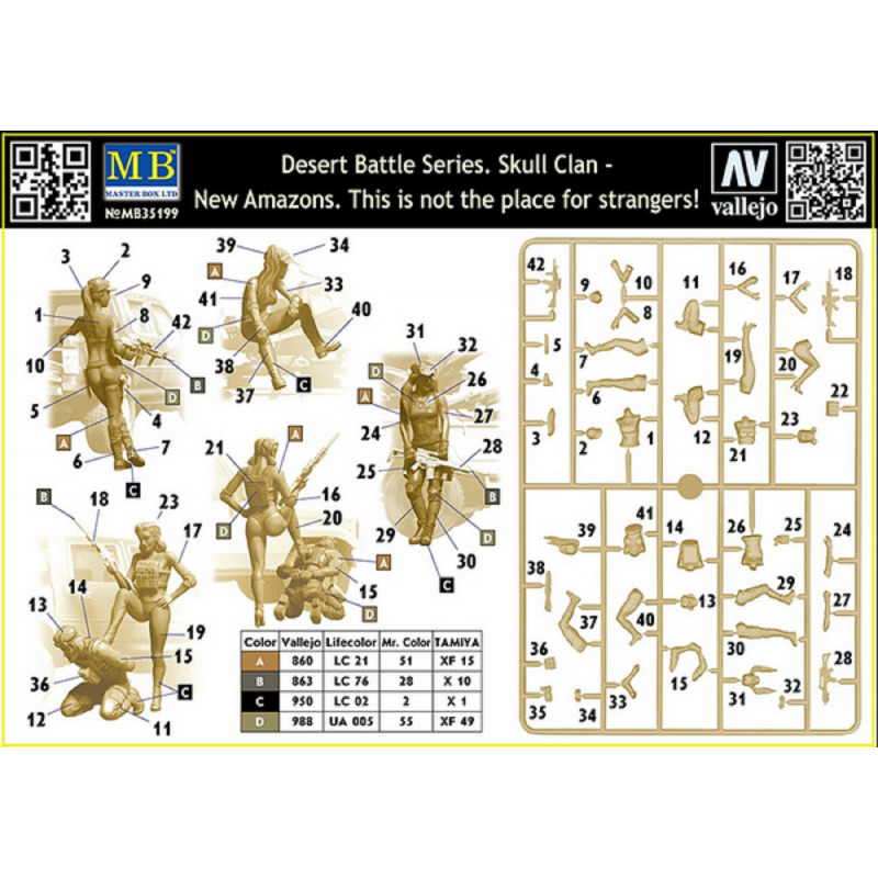Ce set de figurines au 1/35 proposé par Master Box appartient à la série Desert Battle Series et met en scène un groupe de combattants issus du clan fictif Skull Clan dans un univers post-apocalyptique. Intitulé « New Amazons – This is not the place for strangers! », ce kit représente une unité dominée par des guerrières, inspirée d’un imaginaire mêlant survie, affrontements tribaux et environnement désertique hostile.