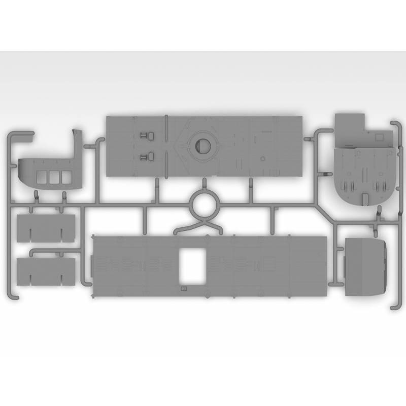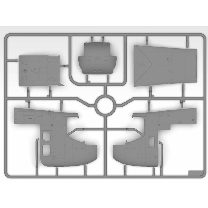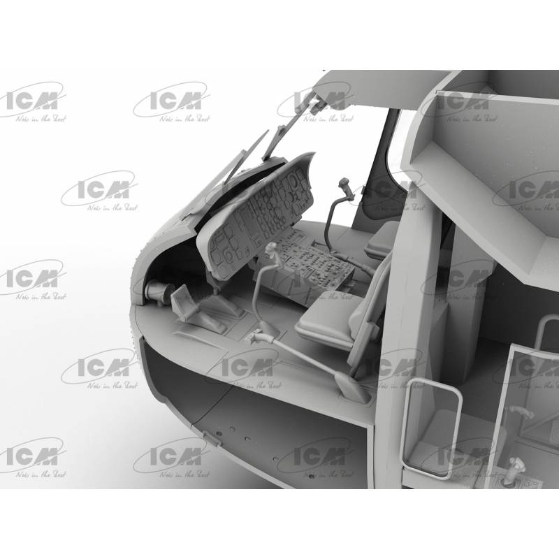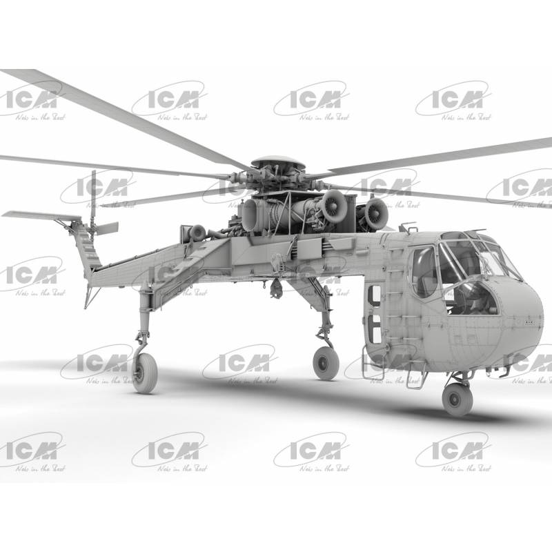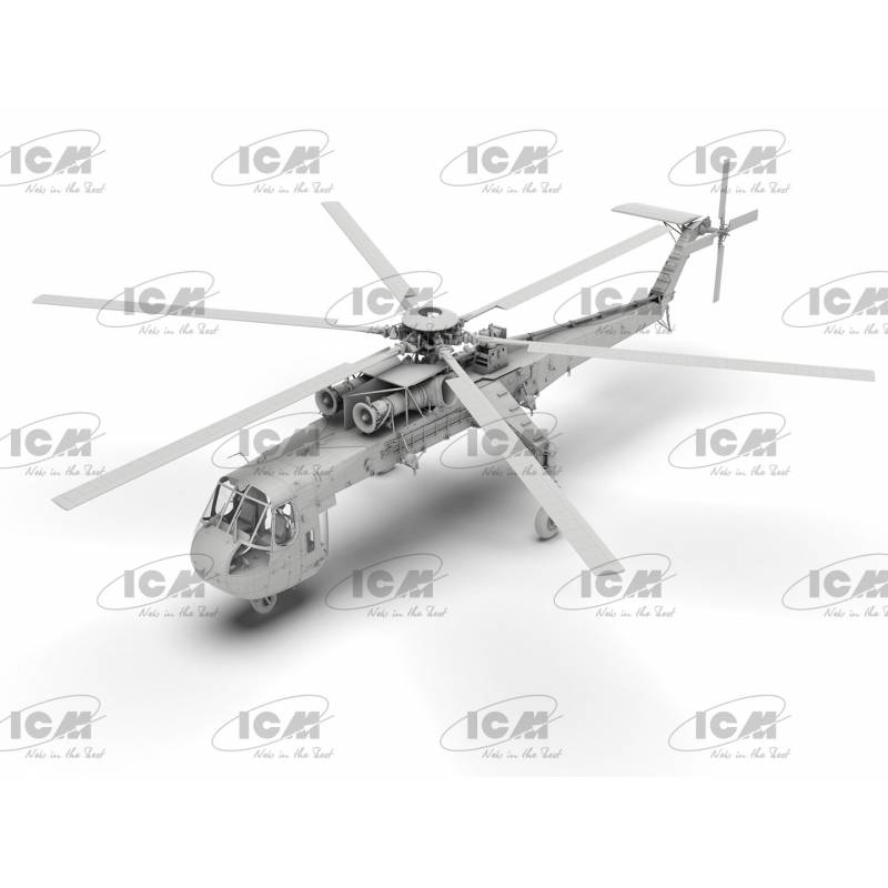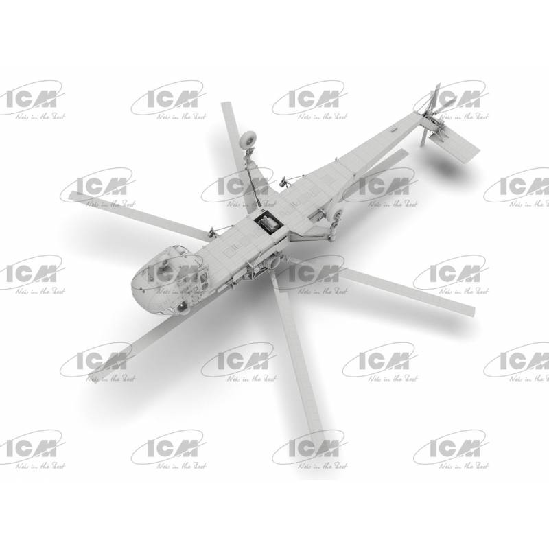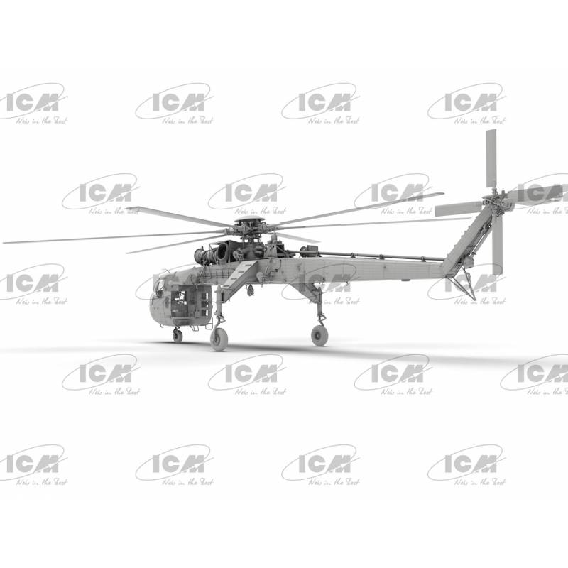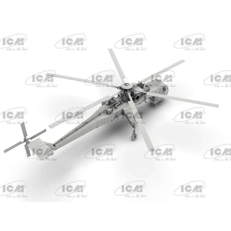 Le kit ICM 53058 à l’échelle 1/48 restitue fidèlement la structure spectaculaire de cet hélicoptère emblématique. Composé de 522 pièces finement détaillées, il permet de reproduire l’appareil avec une précision remarquable : rotor principal à six pales, poutres latérales, treuils et poste de contrôle arrière. Les dimensions finales imposantes (775 mm de longueur pour 225 mm de largeur) témoignent de la taille impressionnante du modèle une fois assemblé. Deux décorations civiles modernes sont proposées :