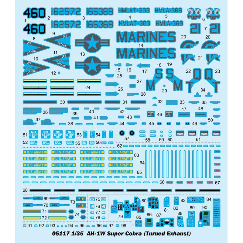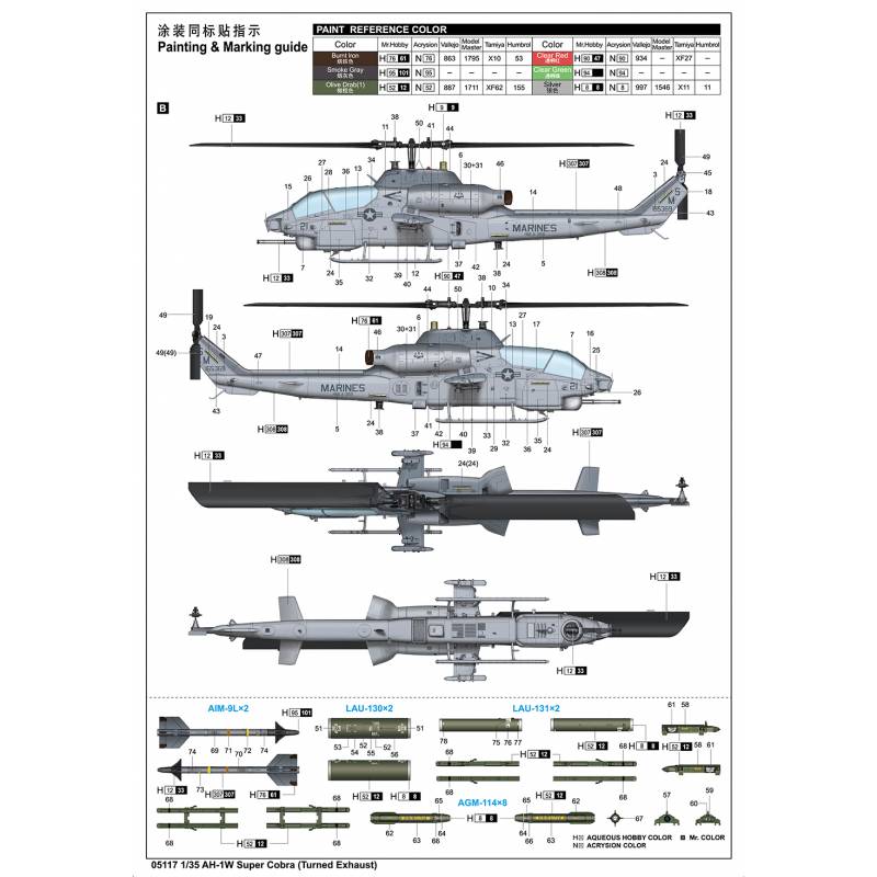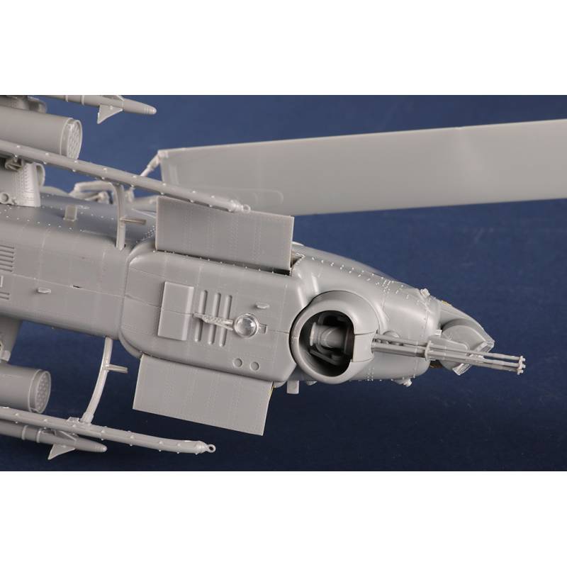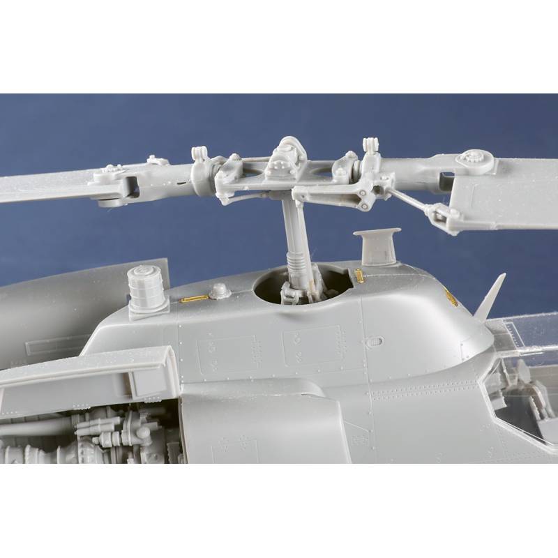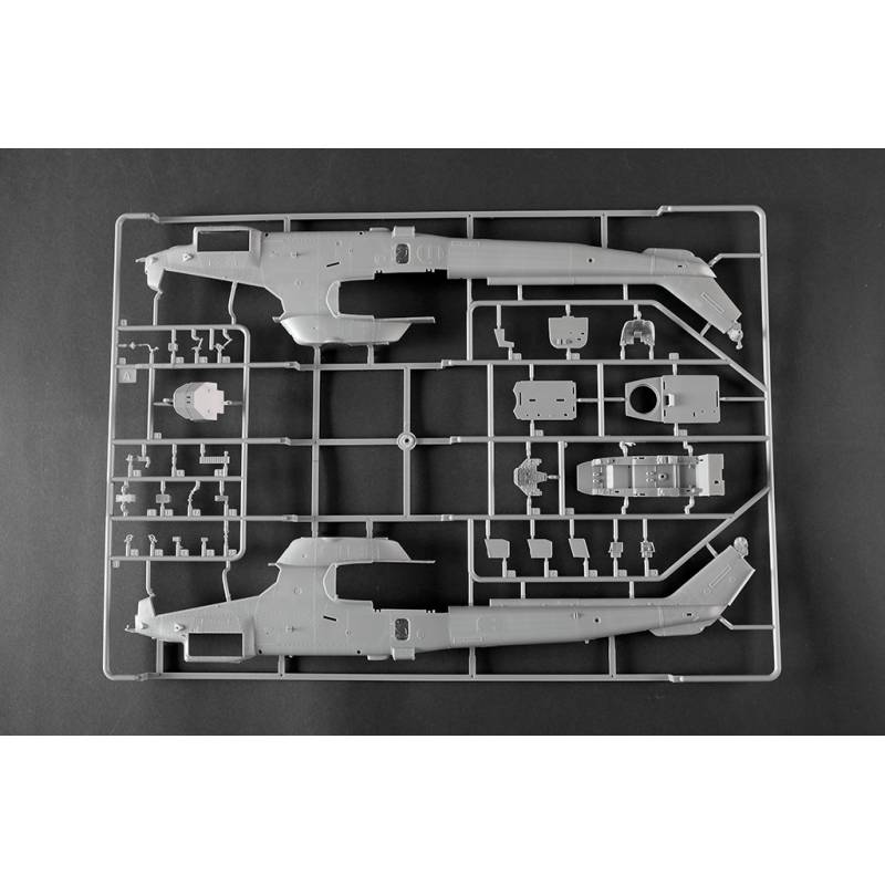 Cette version « Turned Exhaust » se caractérise par ses échappements orientés, destinés à réduire la signature infrarouge de l’appareil et à améliorer sa survivabilité face aux menaces sol-air. La maquette Trumpeter à l’échelle 1:35 restitue fidèlement cette configuration spécifique, avec un haut niveau de détail et des proportions imposantes une fois assemblée. Le modèle terminé atteint environ 469 mm de longueur pour un diamètre de rotor de 419,5 mm, ce qui en fait une pièce majeure dans une collection d’hélicoptères militaires modernes.