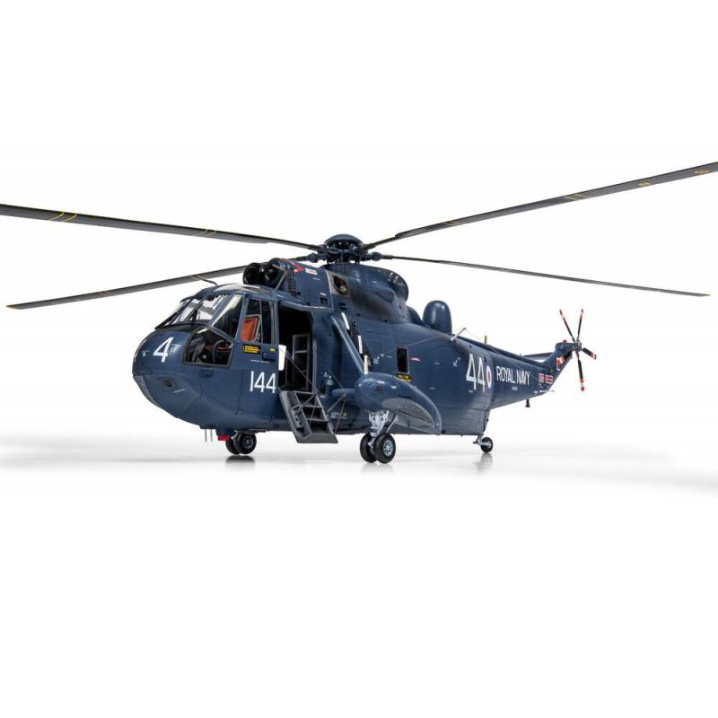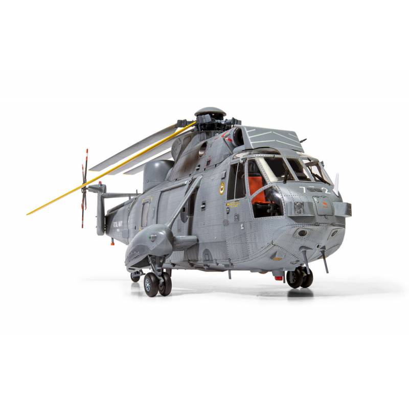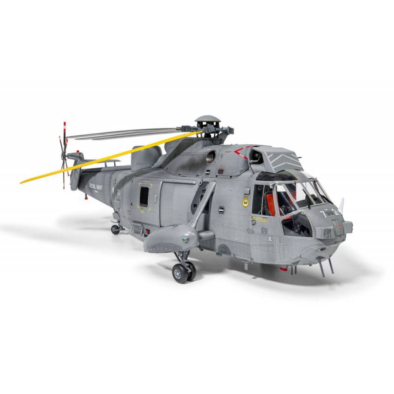 Une fois assemblé, le modèle atteint environ 46 cm de longueur, 39,7 cm de largeur rotor compris et près de 10 cm de hauteur, ce qui en fait une pièce imposante et spectaculaire en vitrine. À cette échelle, le Sea King prend une présence exceptionnelle et permet un travail de peinture, de patine et de mise en scène particulièrement intéressant, qu’il s’agisse d’un appareil embarqué de la Royal Navy, d’une machine utilitaire ou d’un hélicoptère plus récent en livrée civile ou commémorative.