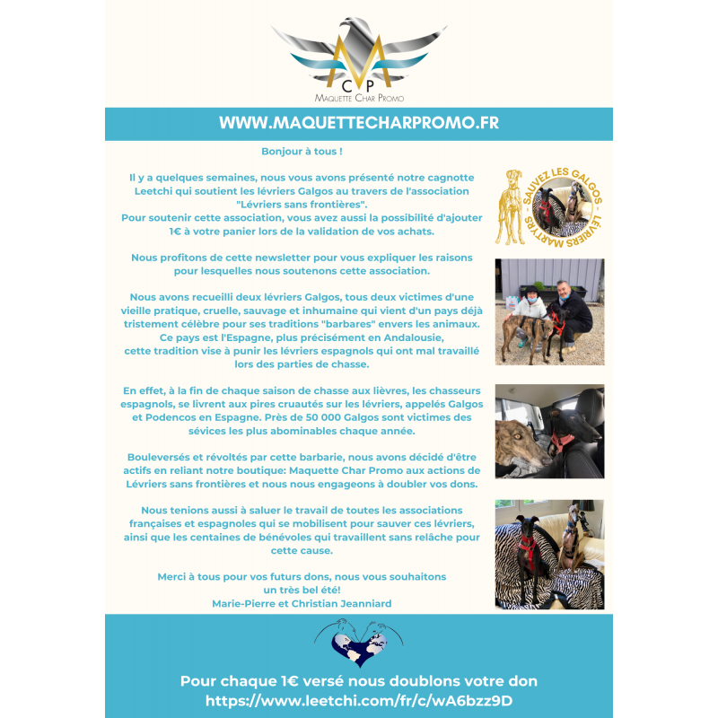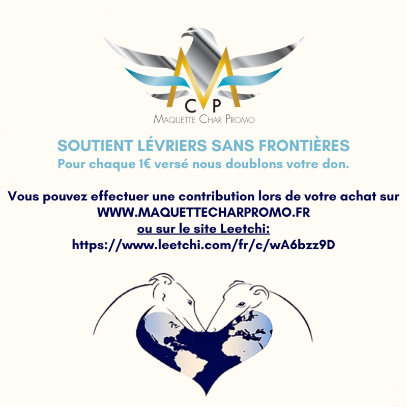 Cet appel est soutenu par Maquette Char Promo, engagé aux côtés de LÉVRIERS SANS FRONTIÈRES pour défendre cette cause essentielle.