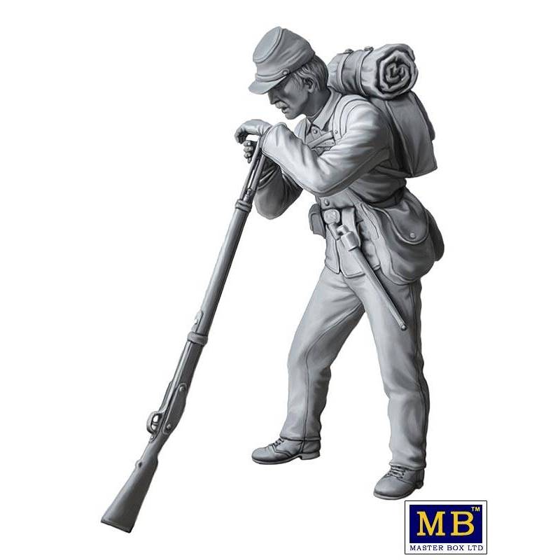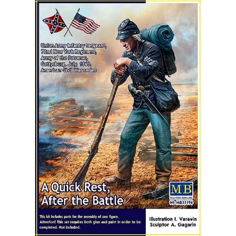 Le kit MASTER BOX 35196 - American Civil War Series: A Quick Rest, After the Battle à l'échelle 1/35 représente un moment de répit pour un soldat après la bataille de Gettysburg en juillet 1863. Ce kit est axé sur l'uniforme et l'apparence d'un sergent d'infanterie de l'Union appartenant au 72e Régiment de New York, faisant partie de l'Armée du Potomac.