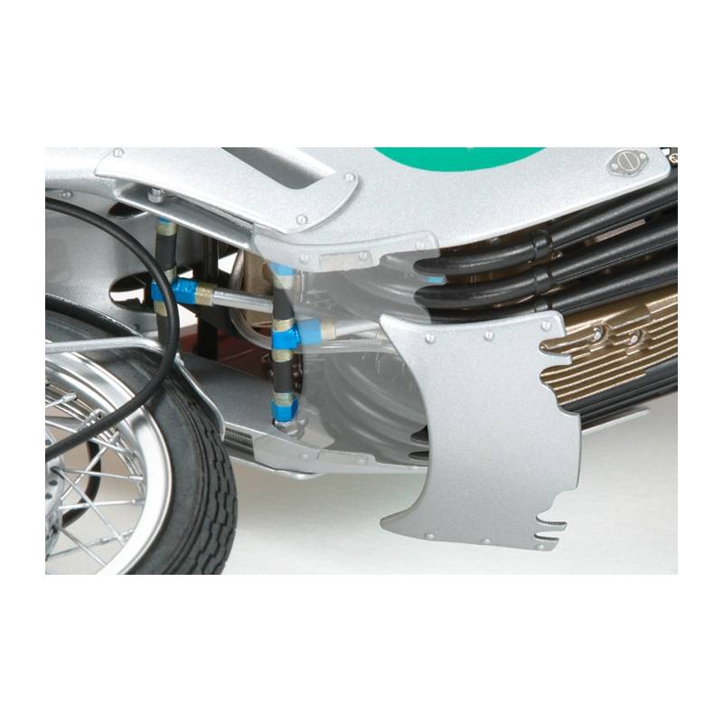 Le kit Tamiya restitue avec précision cette machine mythique, en mettant en valeur la complexité mécanique et la finesse des lignes de la RC166. Fidèle à la réputation de Tamiya, l’ajustement des pièces et la qualité de moulage permettent un montage précis et agréable.