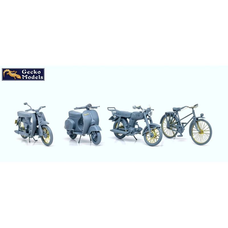 Ce set proposé par Gecko Models représente un ensemble de motos et scooters utilisés au Sud-Viêt Nam dans les années 1960–1970, période marquée par une très forte présence de deux-roues civils dans les rues de Saïgon, Hué ou Da Nang. Avant, pendant et après la guerre du Viêt Nam, ces véhicules légers constituaient l’un des moyens de transport les plus courants : économiques, maniables et capables de circuler dans les ruelles et artères encombrées, ils étaient utilisés aussi bien par les civils que par les forces locales pour des missions de liaison ou de transport léger.