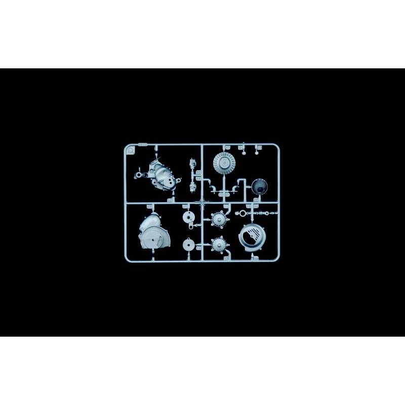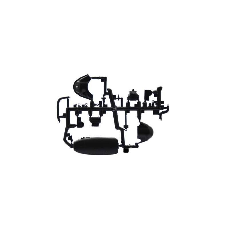 Le kit comprend un ensemble de pièces plastiques finement moulées reproduisant les panneaux de carrosserie, la fourche avant, les roues, le moteur, la selle, les commandes et les nombreux petits éléments extérieurs. Des pièces transparentes sont incluses pour les optiques et feux, tandis que des éléments en photodécoupe permettent d’affiner certains détails décoratifs et emblèmes pour un rendu encore plus réaliste.