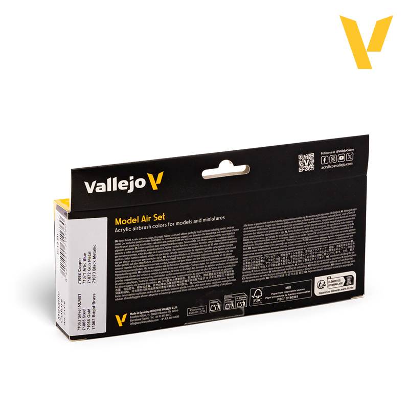 Ce coffret de peintures acryliques Vallejo de la gamme Model Air propose une sélection complète de teintes métalliques destinées à enrichir vos maquettes, figurines et dioramas avec des effets réalistes et nuancés. Conçu pour les maquettistes exigeants, il permet de reproduire aussi bien des surfaces métalliques naturelles que des effets décoratifs ou techniques.