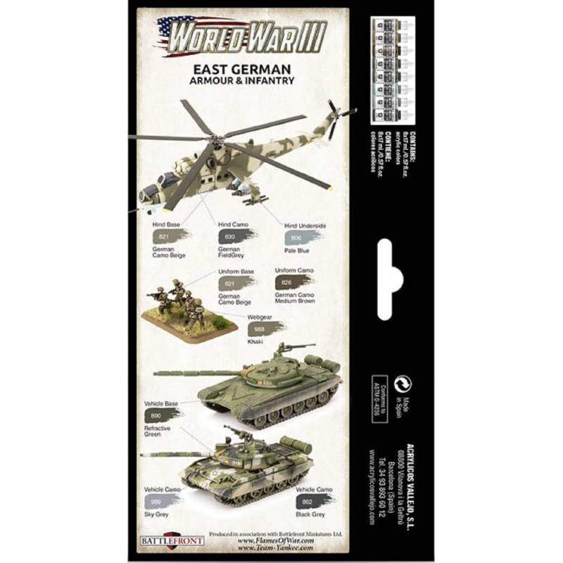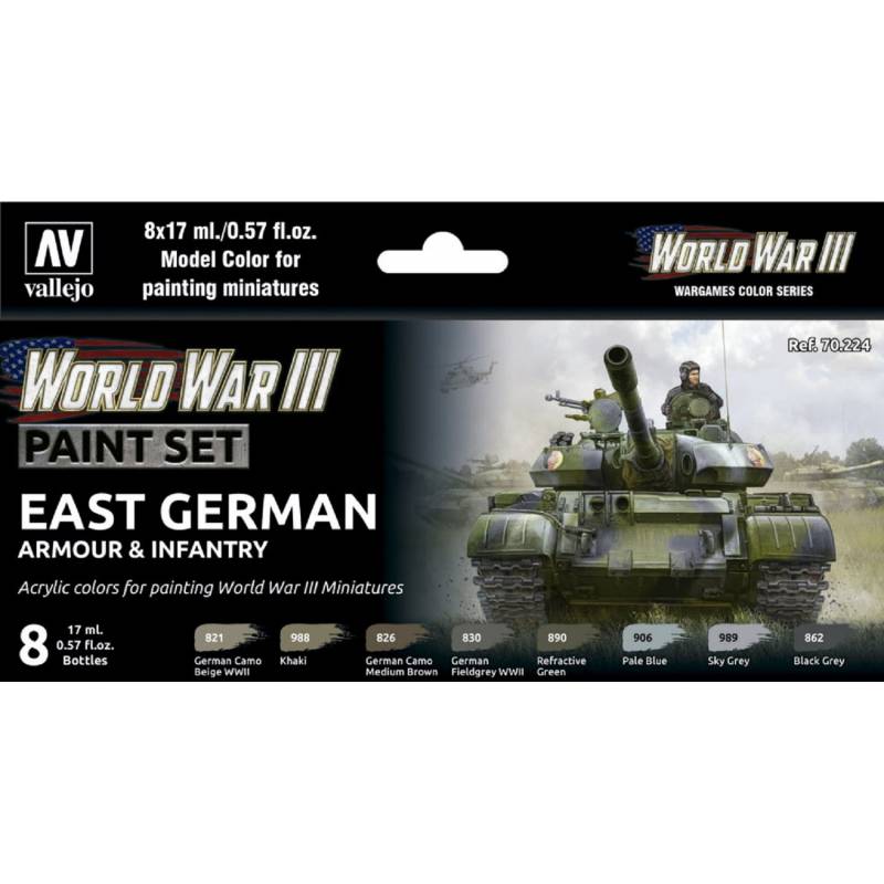 Le set de peintures WWIII East German Armour & Infantry de Vallejo (référence 70224) est un outil indispensable pour les modélistes et joueurs de wargames souhaitant peindre avec authenticité les véhicules blindés, hélicoptères et forces terrestres est-allemands pendant la Guerre froide. Associé au kit de peinture utilitaire, ce coffret contient les teintes spécialisées nécessaires pour représenter les couleurs distinctives des armées est-allemandes, telles que les T-72, les hélicoptères Hind et l’infanterie.