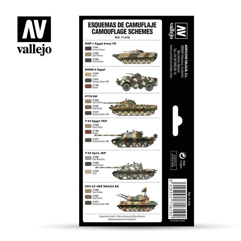 Ce set de la gamme Model Air a été spécialement conçu pour reproduire les schémas de camouflage emblématiques utilisés par les véhicules blindés et les chars engagés dans les conflits du Moyen-Orient, depuis la guerre des Six Jours (1967) jusqu’aux conflits plus récents. Il couvre une grande variété de nations et d’armées impliquées dans des guerres marquées par des environnements arides et des schémas de peinture très caractéristiques : Israël, Égypte, Syrie, Irak, entre autres.