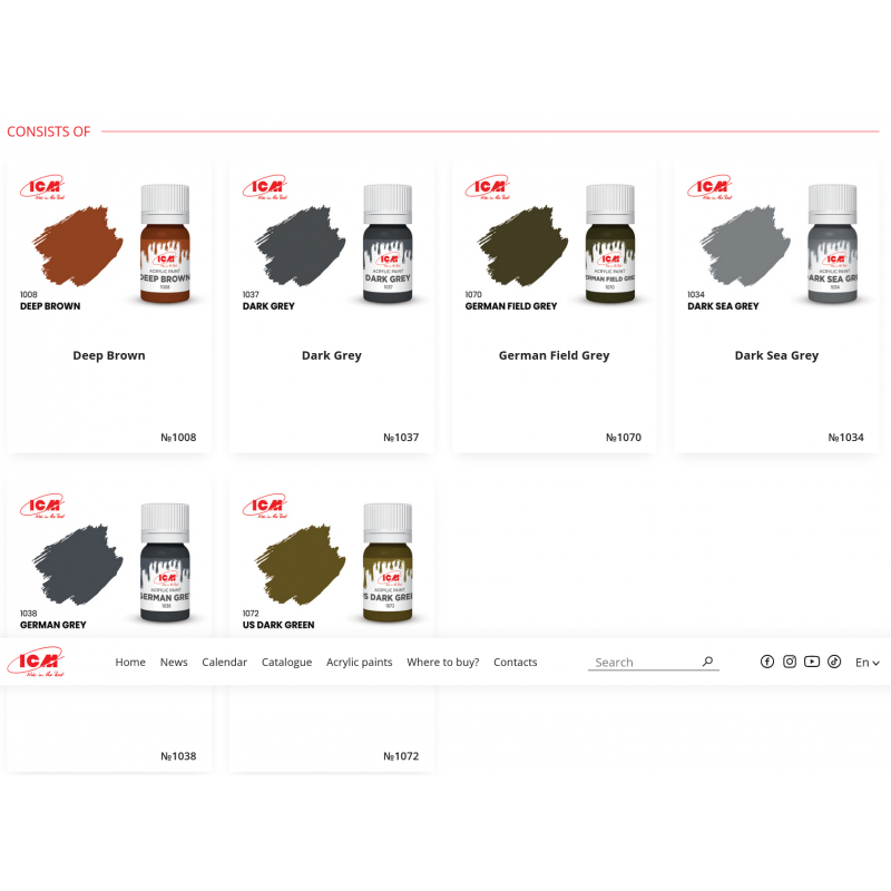 Ce set ICM 3044 réunit six teintes acryliques à l’eau de 12 ml spécialement sélectionnées pour la peinture des uniformes, équipements et accessoires de l’infanterie allemande durant la Première Guerre mondiale. Les couleurs reproduisent fidèlement les nuances du célèbre feldgrau, des cuirs et des tissus d’époque, permettant de restituer l’apparence authentique des soldats de 1914 à 1918.