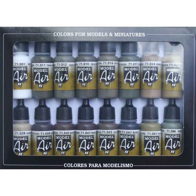 Ce set regroupe 16 teintes essentielles couvrant un large éventail d’utilisations : verts militaires allemands et alliés, teintes sable pour les théâtres désertiques, bruns pour les effets de terrain et de vieillissement, ainsi que des couleurs spécifiques aux blindages et structures. Il permet de reproduire fidèlement les camouflages allemands (RLM, Dunkelgelb), soviétiques (4BO), américains (Olive Drab) et alliés en général.