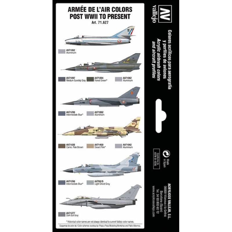 Le set de peintures Armée de l’Air Colors Post WWII to Present de Vallejo (référence 71627) a été développé pour reproduire les schémas de camouflage des avions de l'armée de l'air française, depuis la fin de la Seconde Guerre mondiale jusqu'à aujourd’hui. Ce coffret couvre une large gamme de configurations, allant des finitions métalliques des années 1950 et 1960 aux motifs mimétiques pour les missions de supériorité aérienne ou dans des environnements désertiques, comme le camouflage "Tchad". Il inclut également les teintes modernes pour les avions à faible visibilité.