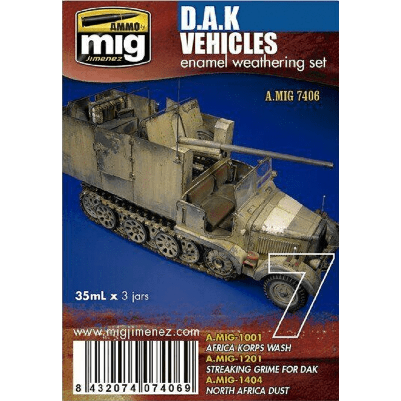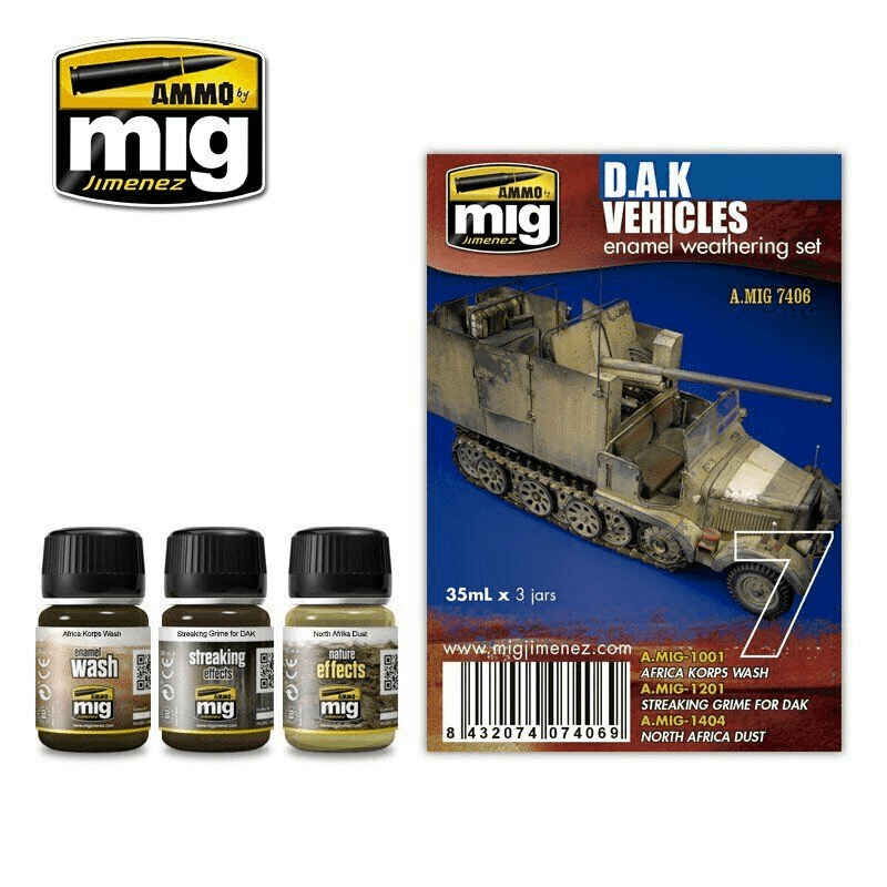 Aussi bien que pour DAK, les Forces Italiennes ou encore les alliées, ce set conviendra pour la peinture des véhicules du désert en Afrique du Nord.L'ensemble comprend un lavage pour les couleurs de sable (A.MIG-1001 AFRICA KORPS WASH), un effet de strie pour les tons de désert (A.MIG-1201 STREAKING GRIME FOR DAK) et un autre émail pour obtenir l'effet de désert typique poussiéreux (A.MIG NORTH AFRICA DUST -1404)