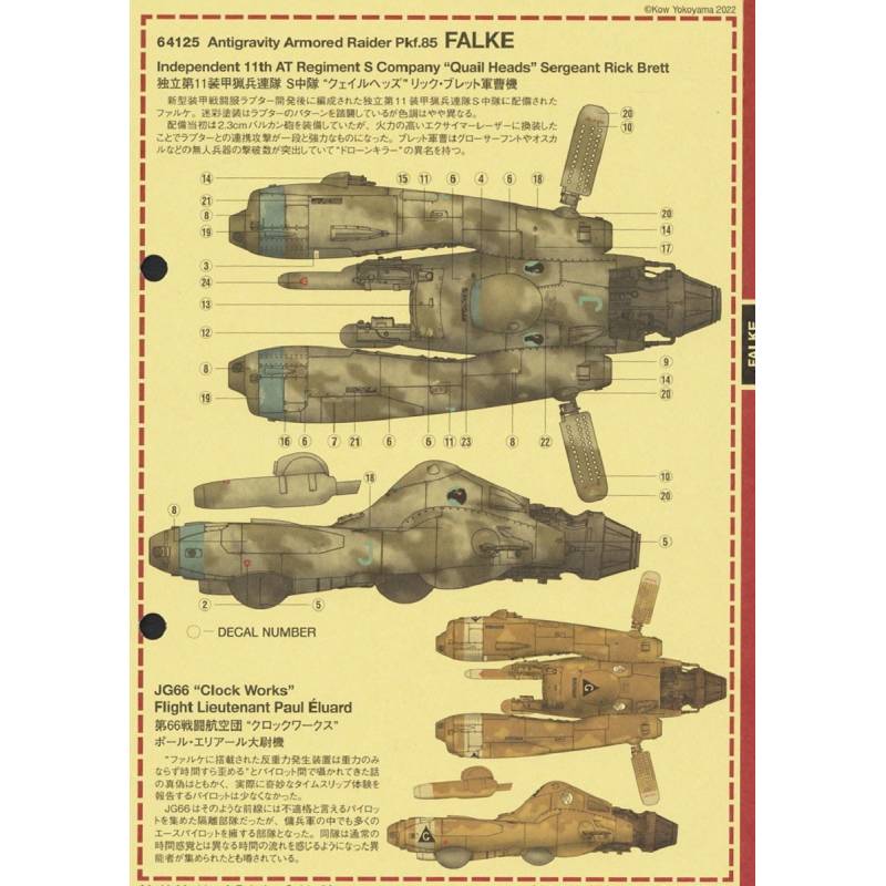Le Falke Pkf.85 est l’un des engins antigravité emblématiques de l’univers Maschinen Krieger ZbV 3000 (Ma.K), créé par Kow Yokoyama. Conçu comme un appareil de reconnaissance et d’attaque rapide, le Falke combine les lignes d’un chasseur futuriste et la logique mécanique d’un blindé. Son esthétique industrielle et sa conception fonctionnelle incarnent pleinement la philosophie du Ma.K : un futur alternatif où la technologie, usée et réaliste, évolue dans des environnements de guerre planétaire.
