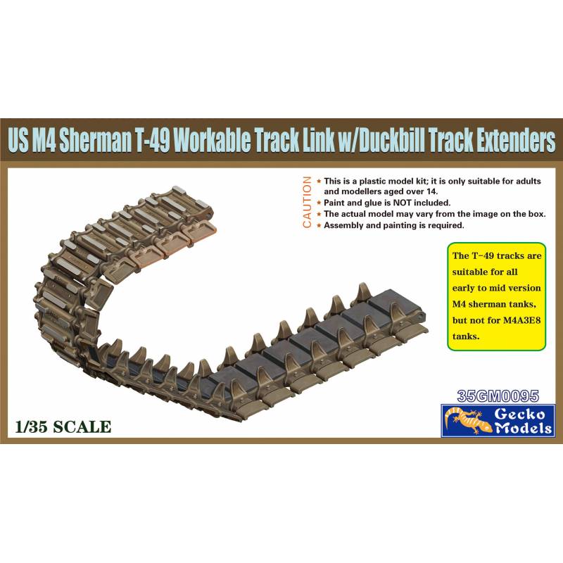 Ce set Gecko Models permet de reproduire avec une grande précision les chenilles américaines T-49 utilisées sur les chars M4 Sherman, ici dans une version entièrement articulée (“workable”) et accompagnée des célèbres duckbill — des élargisseurs de patins ajoutés pour améliorer la portance sur terrains meubles, notamment en Normandie et dans les zones marécageuses d’Europe de l’Ouest.