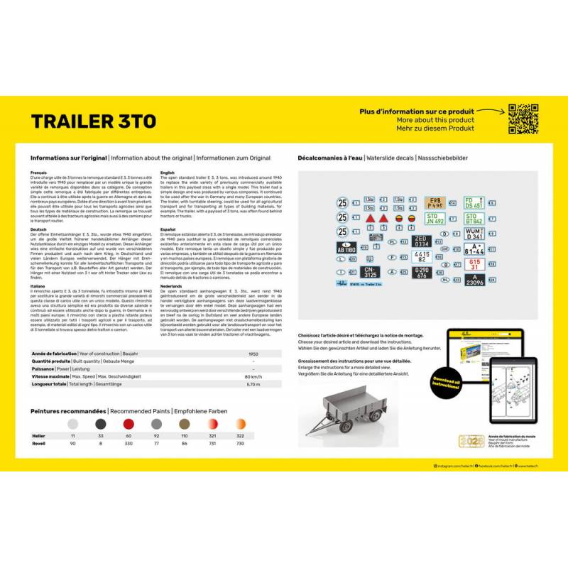 Compacte, simple mais historiquement représentative, la remorque Trailer 3TO Heller trouve naturellement sa place auprès des maquettistes passionnés par les scènes rurales européennes, les véhicules utilitaires ou les accessoires permettant d’enrichir un diorama civil réaliste. Grâce à sa conception claire et à son héritage technique bien documenté, ce kit offre une excellente base pour une représentation fidèle ou personnalisée selon l’environnement choisi.