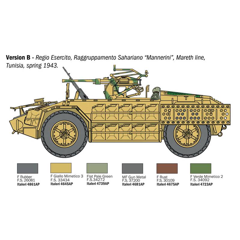 La maquette Italeri à l’échelle 1/72 restitue fidèlement les lignes épurées et le profil désertique de ce véhicule emblématique du Regio Esercito. Ce kit, classé niveau 2, s’adresse aux maquettistes de tous niveaux souhaitant intégrer un sujet original et rarement traité dans leurs dioramas africains. Le montage est rapide mais précis, avec des détails soignés malgré la petite échelle.