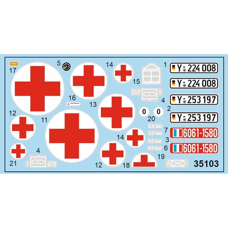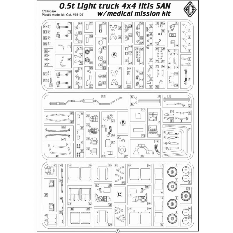 Le kit ACE reproduit fidèlement cette version spécialisée, en reprenant les bases du précédent Iltis 4x4 du fabricant, enrichies de nouvelles pièces spécifiques à la configuration médicale. Le contenu comprend 7 grappes en plastique vert olive, un grappage transparent pour les vitres, deux planches de photodécoupe, des pneus en vinyle souple, une planche de décalcomanies et une notice de montage détaillée.