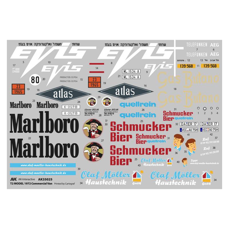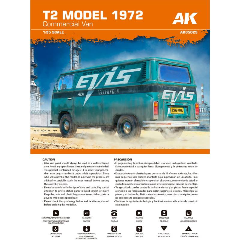 La référence AK35025 représente la version tôlée (fourgon fermé) avec les modifications extérieures introduites en 1972, correspondant à une évolution marquante du T2 avec des ajustements de carrosserie et d’équipements. Cette version est typique des années 1970 à nos jours, ce qui ouvre un champ extrêmement large de possibilités de mise en scène.